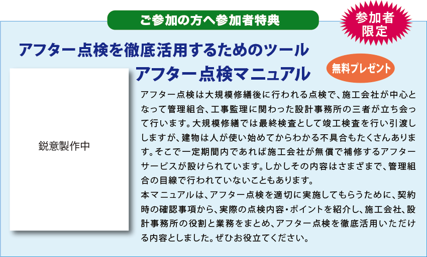 将来の大規模修繕について委員会での考えがまとまらず、修繕委員全員でセミナーに参加したのですが、大規模修繕を軽く考えすぎていたと反省させられました。施工会社の選定基準もわからないし、施工内容や見積もりの是非なんて、素人知識で対応できるものではありません。今後はセミナーでいただいた『大規模修繕マニュアル』を組合の共有情報にして、組合員みんなが満足のいく大規模修繕を考えていきたいと思います。